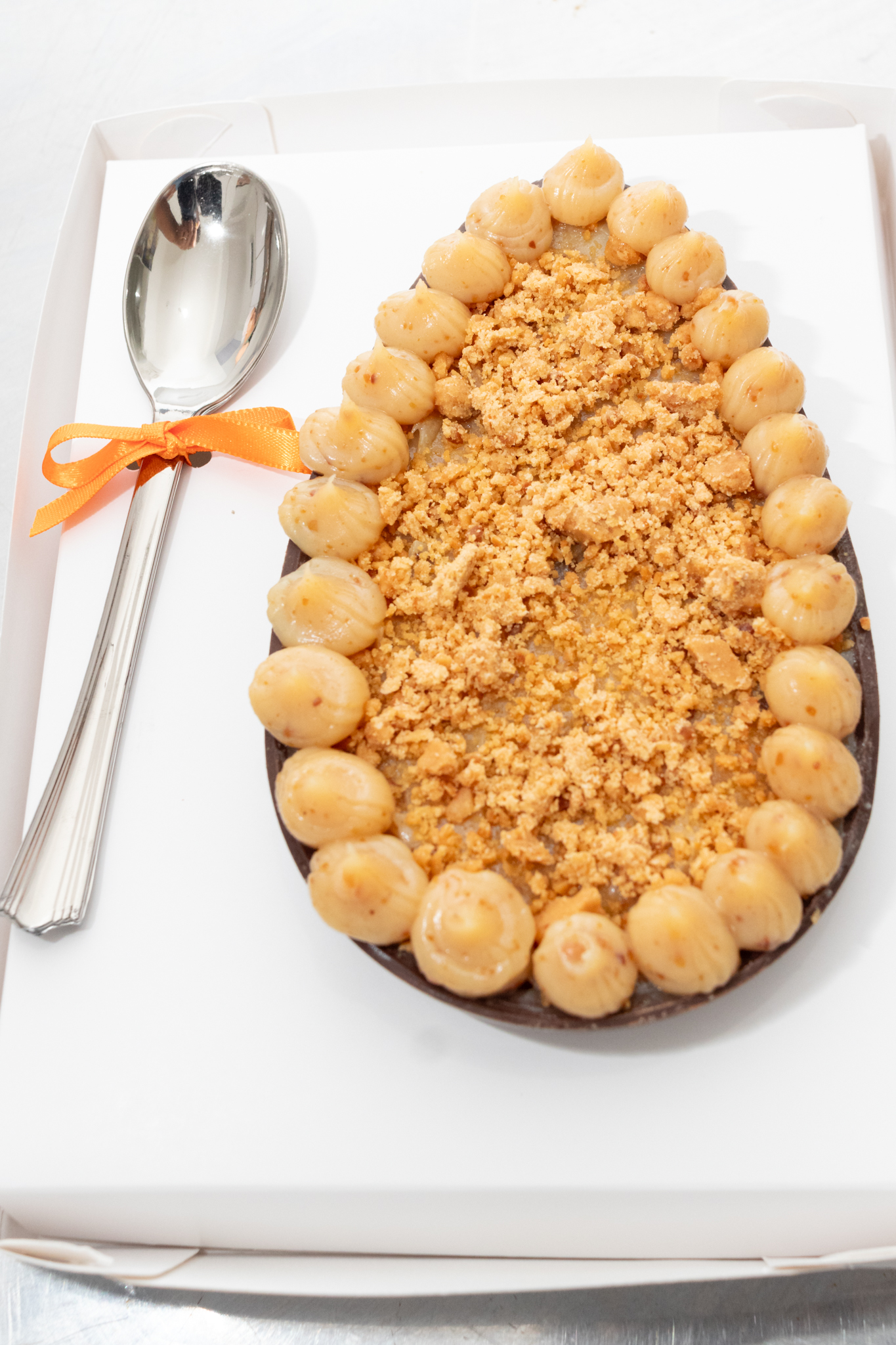 Ovo da páscoa de chocolate recheado com brigadeiro de amendoim e paçoca.